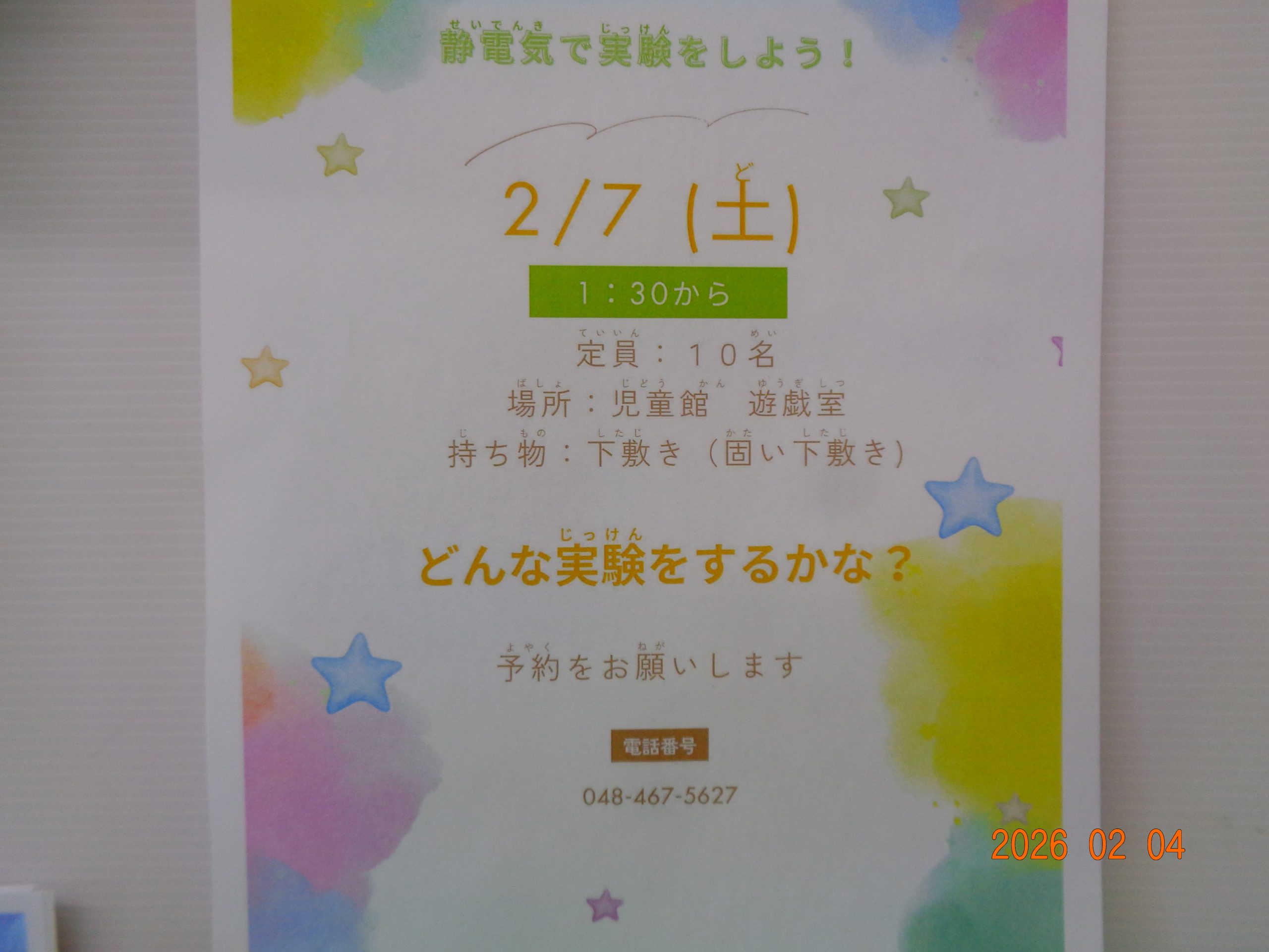 日時:2月7日土曜日 時間:13:30~ 場所:ゆうぎ室 持ち物:下敷き(固いもの) 「静電気⚡ってしってる?」 楽 ……
