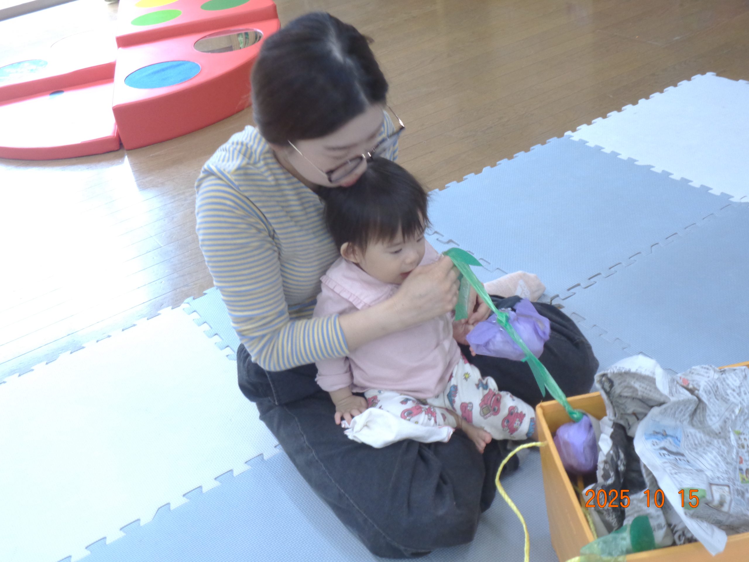 10月は、ハロウィン🎃バック製作をチャレンジ。大きな栗の木の下でやお芋堀ゴッコ、絵本「おやさいさん」の読み聞かせをやりました。お芋ほりゴッコはお母さんも一緒に「うんとこせ♪」と とっても楽しそうでした。