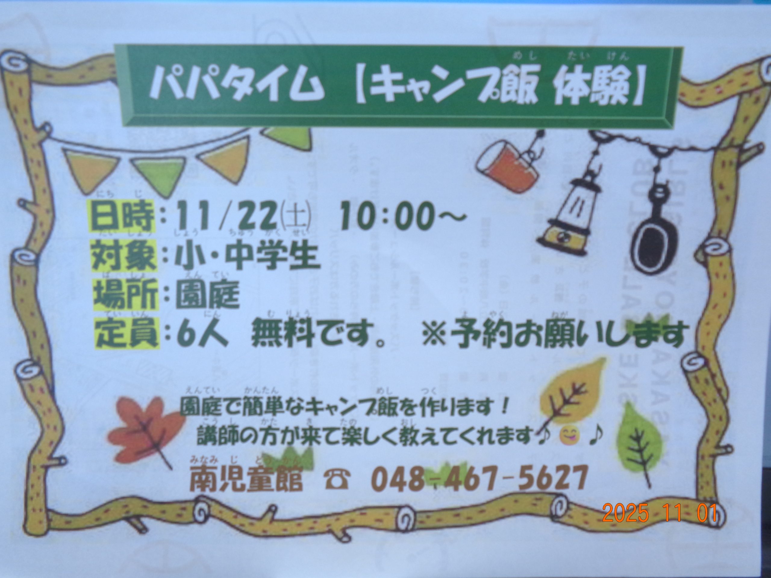 11/22㈯ 10:00~12:00位 対象:小中学生 ※予約お願いいたします 是非、お父さんの参加もお待ちしていま ……