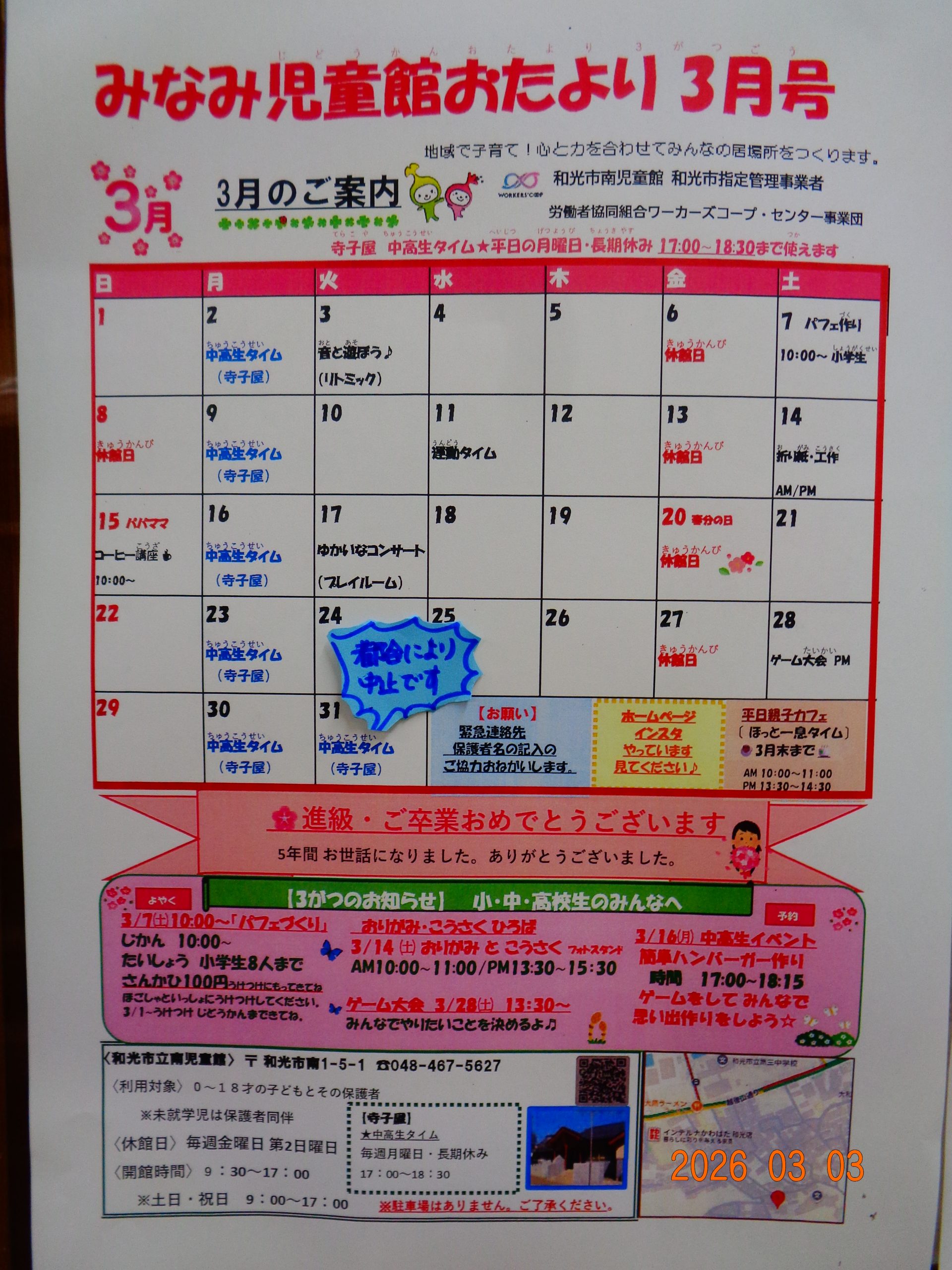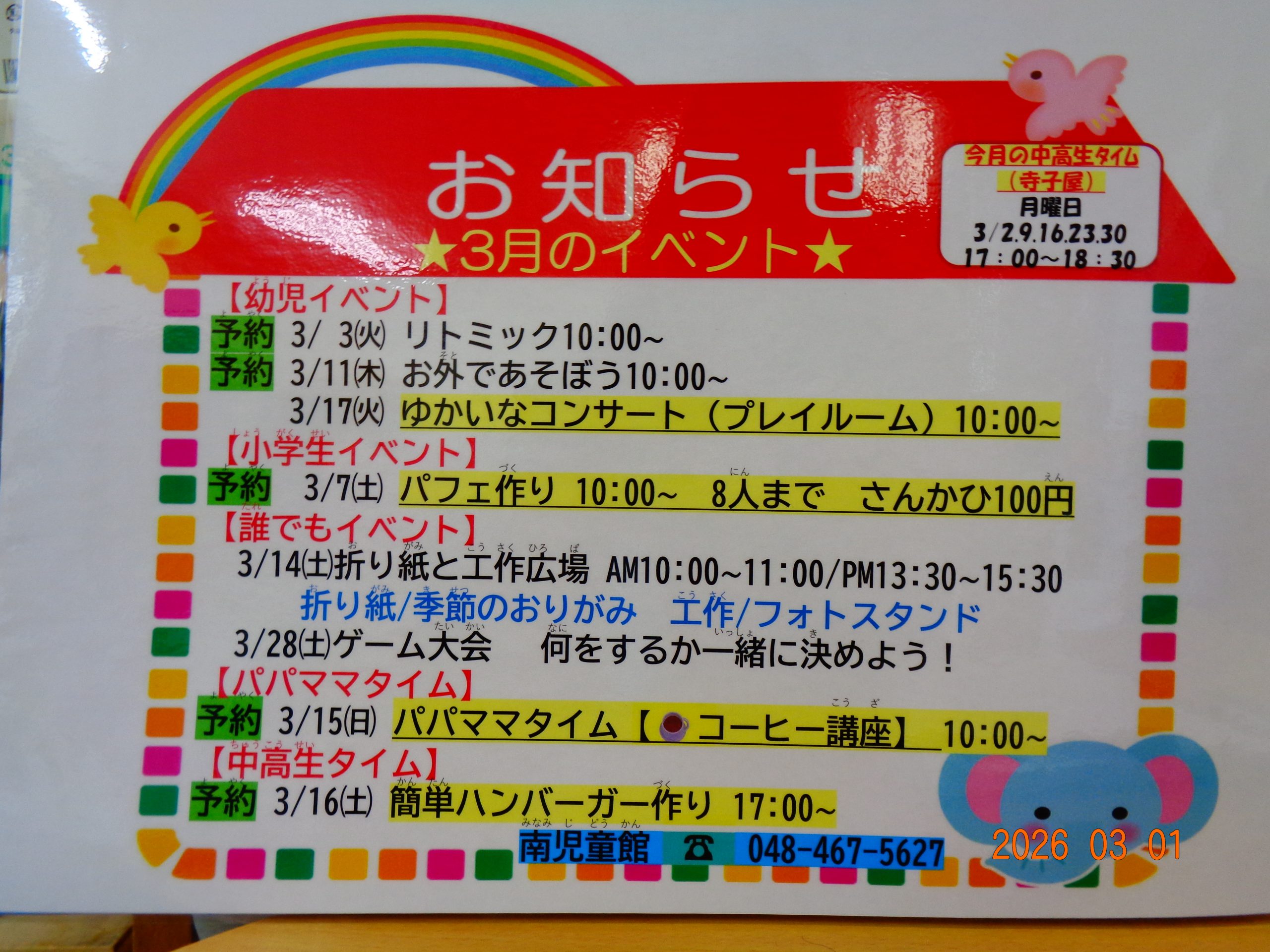 3月も いろいろなイベントをご用意しています。 ご予約お待ちしおります。 南児童館に ぜひ遊びに来てください。 ……